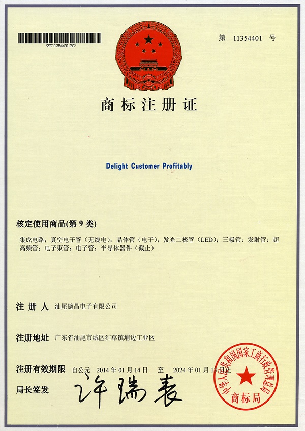 是汕尾德昌電子有限公司在中國(guó)的注冊(cè)商標(biāo)之一,受法律保護(hù),侵權(quán)必究。 未經(jīng)汕尾德昌電子有限公司書面許可,任何單位和個(gè)人不得以任何方式或理由對(duì)該商標(biāo)